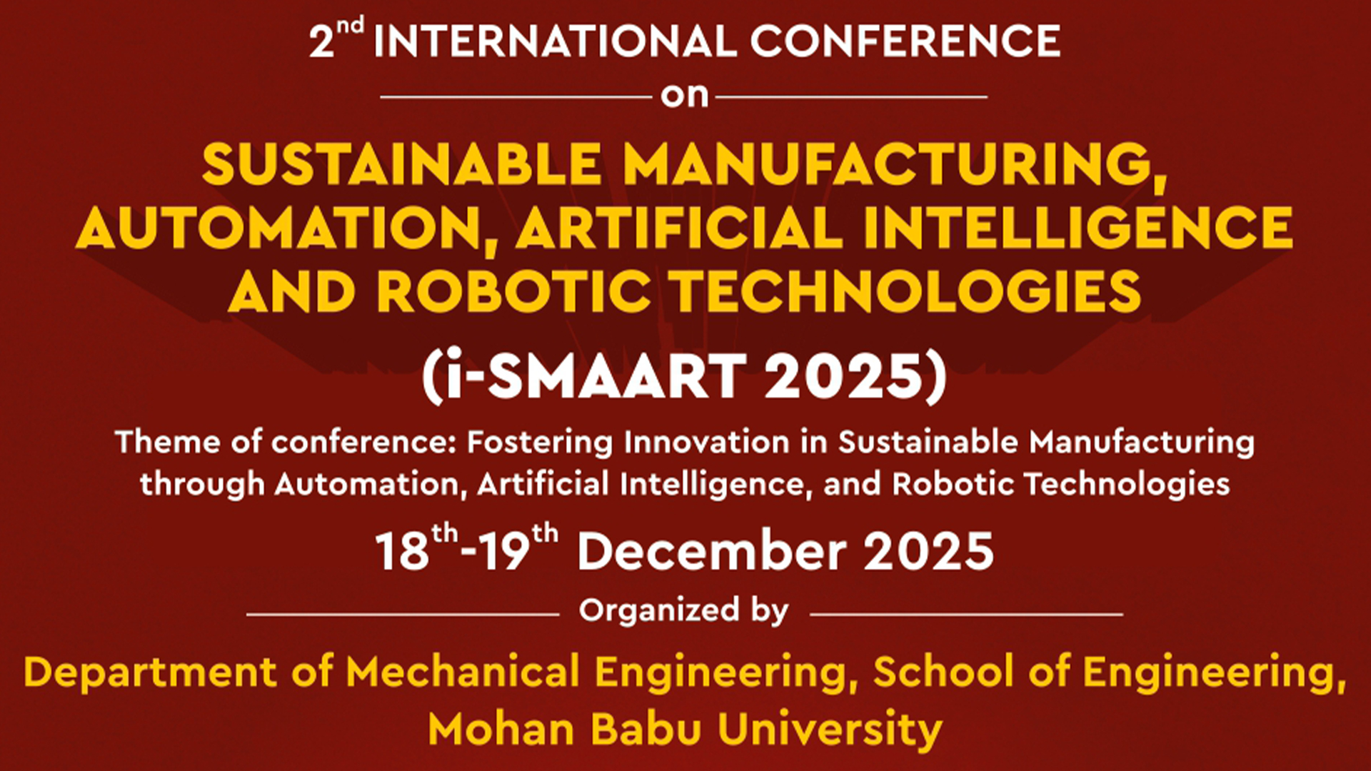 The 2nd International Conference on Sustainable Manufacturing, Automation, Artificial Intelligence and Robotic Technologies (i-SMAART 2025) aims to bring together a global community of researchers, academicians, industry practitioners, and policymakers to explore emerging trends and innovations that shape the future of intelligent and eco-friendly manufacturing systems. With a strong focus on sustainability and digital transformation, the conference will serve as a dynamic platform to discuss how cutting-edge technologies—such as Artificial Intelligence (AI), Machine Learning (ML), Internet of Things (IoT), Cyber-Physical Systems, and advanced Robotics—are revolutionizing modern manufacturing and industrial practices.