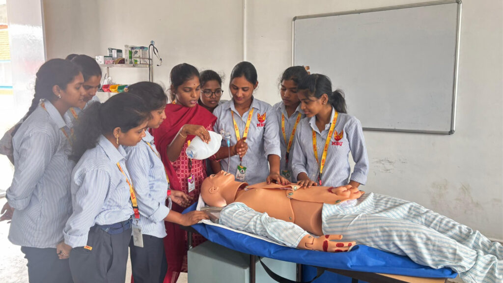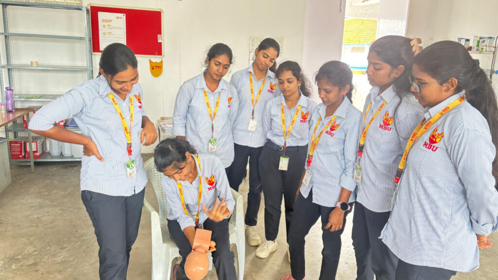The First Aid Force Club, the School of Paramedical Allied and Health Care Sciences (SOPAHCS) of MBU, organized an insightful event titled “Choking Management – Hands-On with Peers” on 11th September 2025, from 12:00 PM to 1:00 PM. The session saw the active participation of 55 students. It aimed at equipping students with crucial life-saving skills.