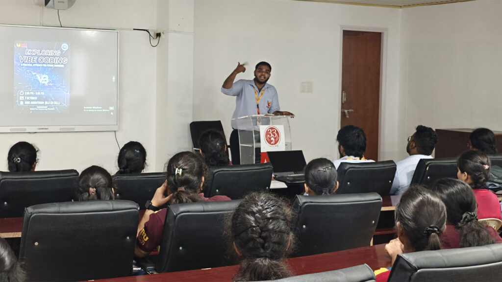 The Coding Club of the Department of AIML, School of Computing of MBU, organized an exciting event titled “Vibe Coding” on 7th October 2025 at the Mini Auditorium. With a vibrant atmosphere and enthusiastic participation, the event brought together students eager to explore the world of artificial intelligence.