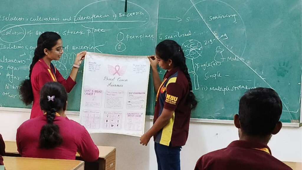 The Pharma Club of MBU organized a two-day awareness program on October 23rd and 24th, 2025 as part of Breast Cancer Awareness Month. The event was held at Lecture Hall 3 in the NAB Block and brought together students, faculty, and health professionals to shed light on breast cancer prevention and early detection. The initiative was supported by the Department of Pharmacy Practice, MB School of Pharmaceutical Sciences, in association with the IQAC, NSS Unit, and Women Empowerment Cell of MBU.