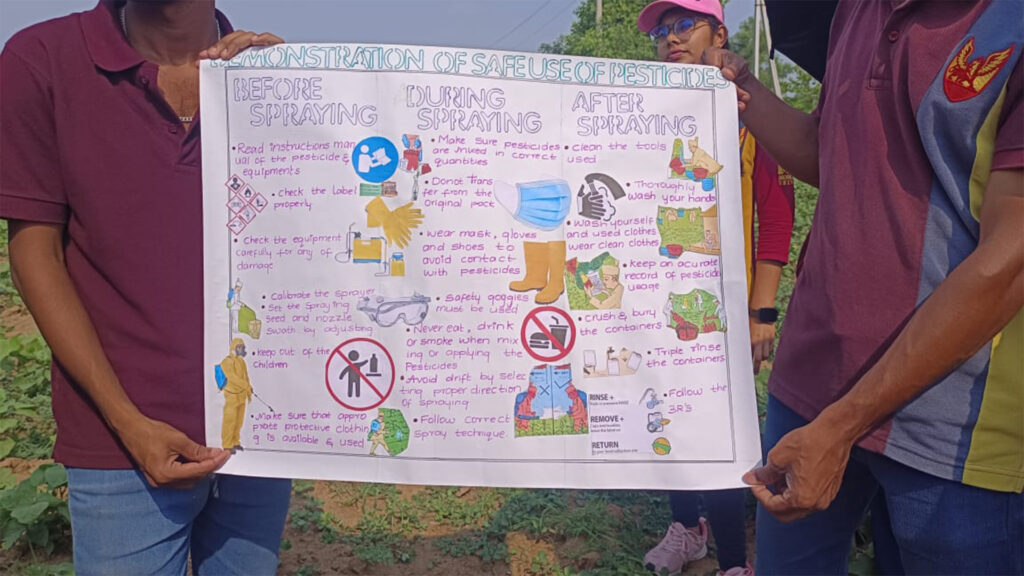The session proceeded with a hands-on demonstration where the students observed the correct methods of mixing, spraying, and handling the pesticides. The faculty members advocated to them the precautionary measures to follow, including wearing personal protective equipment such as gloves and masks, following recommended dosage guidelines to avoid overuse, and proper disposal methods for pesticide containers to minimize environmental contamination.