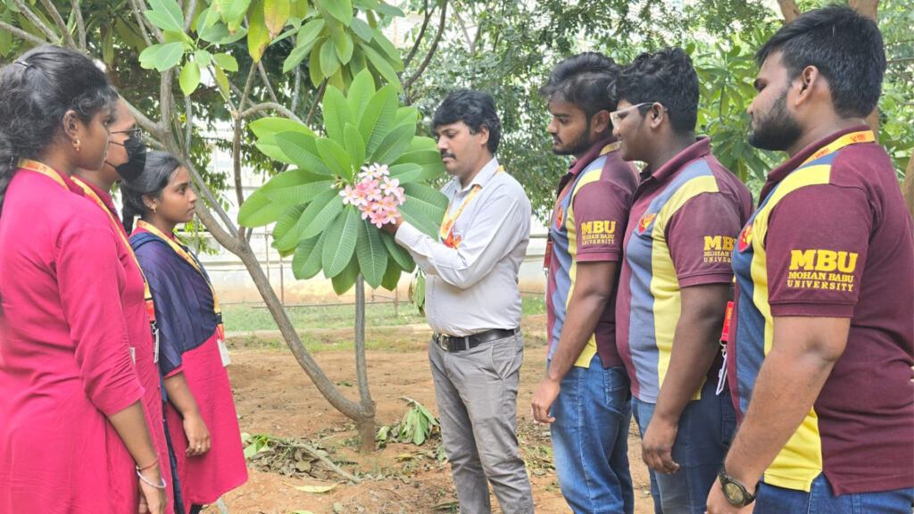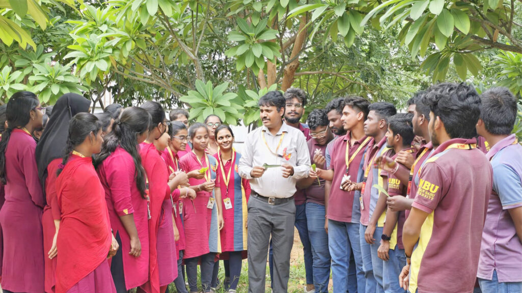 During the walk, students explored the campus and observed trees like Plumeria, neem, amaltas, ficus, banyan, pagoda, and mango. Dr. Mallikarjuna guided them in spotting unique features and shared stories about each tree’s ecological role. The walk turned into a lively learning experience, blending science with curiosity and appreciation.