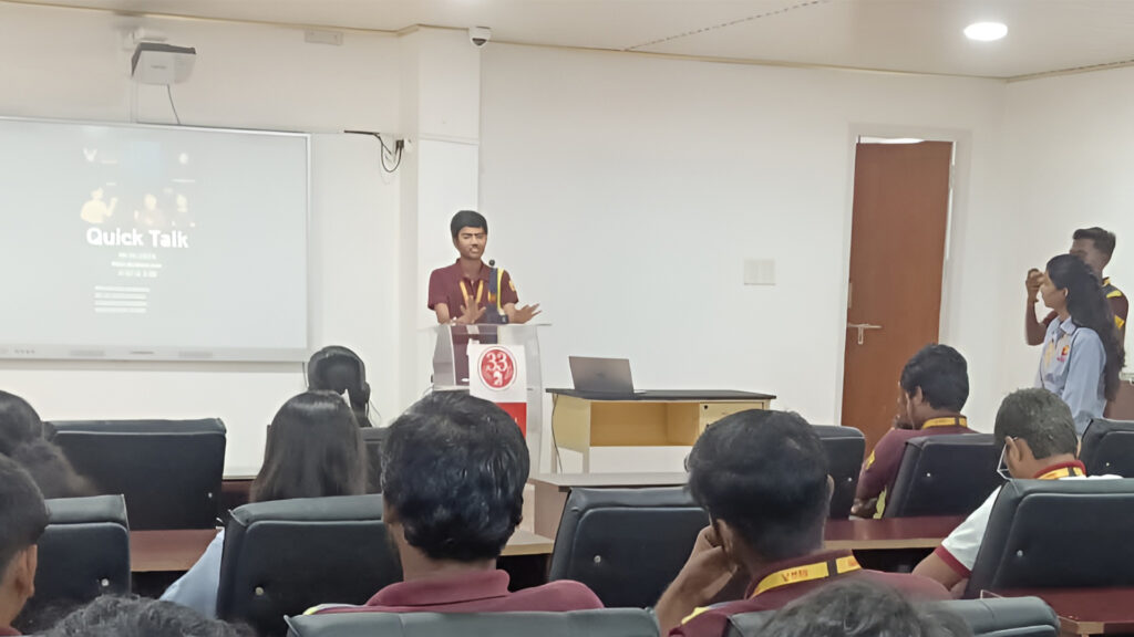 The SPIKES Club, the Department of Electrical and Electronics Engineering, organized an engaging event titled “Quick Talk” on 7th November 2025. The program was held in the Mini Auditorium from 2:00 PM to 3:30 PM. It was designed as a lively and interactive session where students could come together to share ideas, speak freely, and listen to one another.