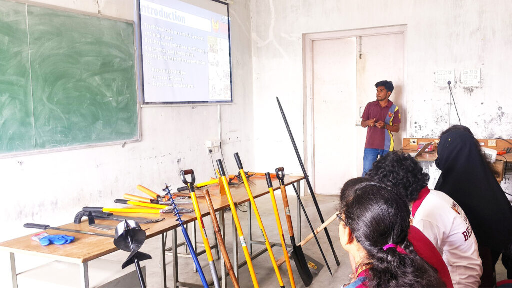 During the activity, various traditional farm tools were displayed, and their uses were explained in detail. Students were introduced to the concept of ergonomics and how it plays a vital role in reducing physical strain for farmers. Few students explained the importance of ergonomic tools in farming through PPTs. They were encouraged to think about factors like durability, cost-effectiveness, and ease of use while redesigning tools. The session was conducted in a friendly and open manner, allowing students to ask questions and share suggestions freely.