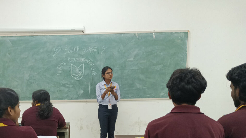 The Rural Development Club of Mohan Babu University organized an event titled “Solar Surge” on 27th March 2025 from 3.30 P.M. to 4.30 P.M. at Room No. 4120 in the New Academic Block. This event’s primary objective was to discuss the present development trends of solar energy and the need of shaping a sustainable and self-sufficient future. This event was mainly conducted to create awareness of the rapid adoption of solar energy, government incentives, and sustainability efforts.