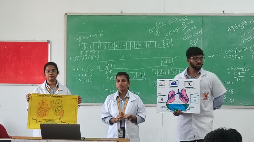 The event commenced at 10:00 AM with an introductory gathering at the department. This was followed by an opening address on Lung Cancer Awareness, delivered by Mr. Manas Chakravarthy, Head of the Department. Subsequently, Assistant Professor R.S. Angeline Yehudhiya encouraged the students to actively engage in the awareness program and contribute to the chart presentations. As part of the program, students made chart presentations and plug cards that explained the causes, symptoms, and ways to prevent lung cancer.