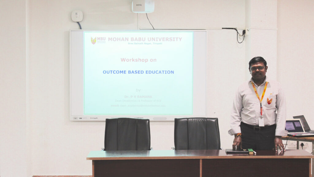 Dr. P. V. Ramana, the resource person, is seen delivering an insightful session on the practical implementation of Outcome-Based Education (OBE) within higher education systems